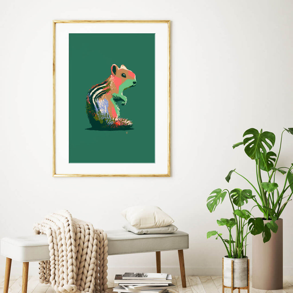 What is it about chipmunks that makes them so gosh-darn cute? Is it their big brown eyes? Their tiny, human-looking hands? Maybe it's their expressive little faces. Whatever it is, chipmunks pretty much had me at hello. I hope this modern chipmunk art print in funky forest colors brings a dash of whimsy to your interior.
