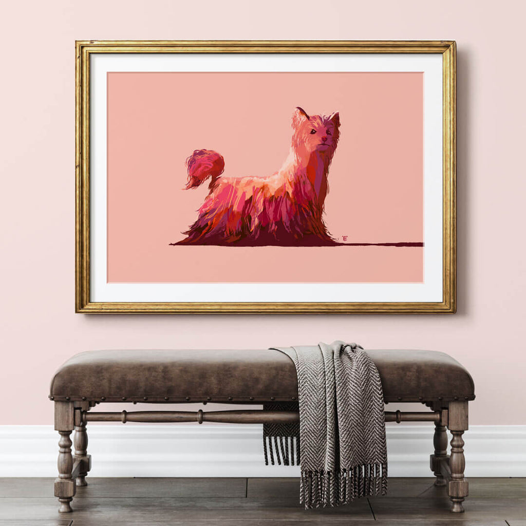 Do they know how fancy they are? Surely Yorkies have some inkling of their incontestable fineness. This modern Yorkshire terrier art print in bold, Pop Art hues can infuse your modern, new traditional, or Hollywood glam interior with a style statement.