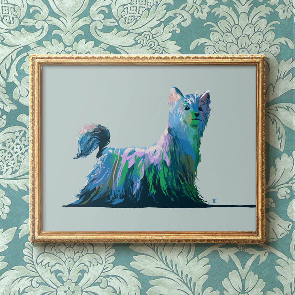 Sweet and funny, with a tendency toward lovable pomposity. A Yorkie's personality is as big as it gets, as anyone lucky enough to have one surely knows. This minimalist Yorkshire terrier print in cool tones is here to bring a fancy little something to your home or office.