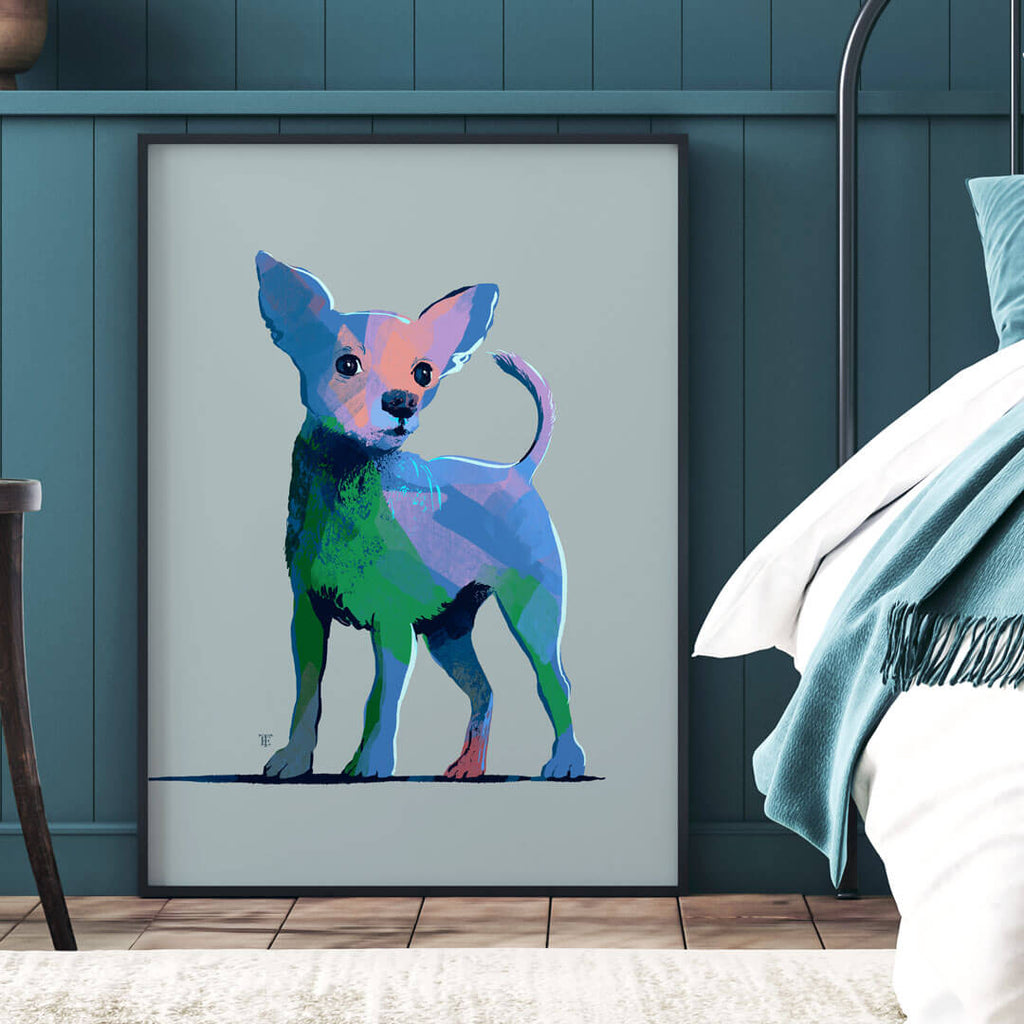 Who wouldn't love those big, curious eyes? Every Chihuahua I've ever known is a big dog trapped in a tiny body. I made this chihuahua art print in blue lines and colorful strokes to help you breathe new life into your home decor while paying tribute to these pint-sized pups.
