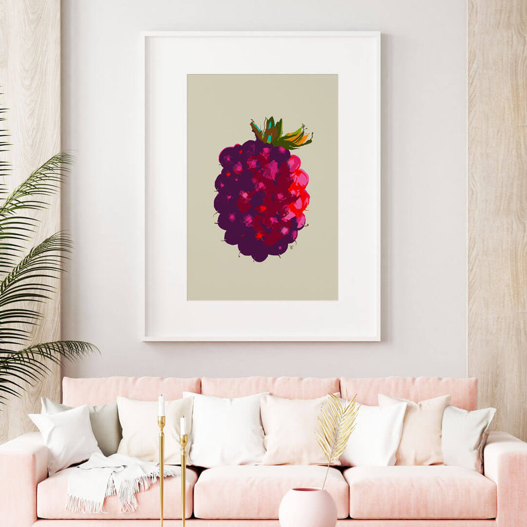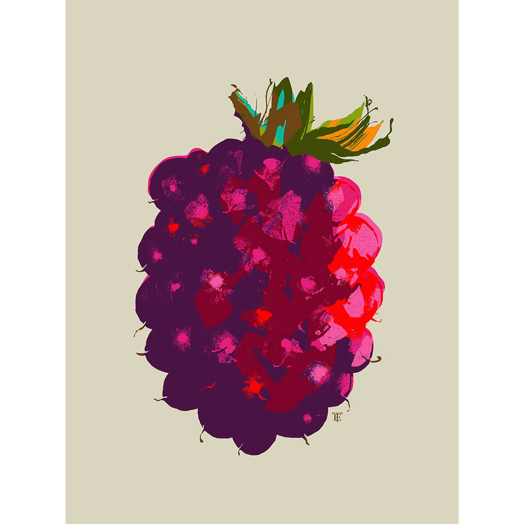 We grew blackberries in the back yard when I was a kid growing up in Alabama. In the summer, once they were ripe, they'd get covered with binge-drinking June bugs if you didn't pick them quickly enough. I created this modern blackberry art print to help you connect to the pure joy of fruit—even if you're a beetle.