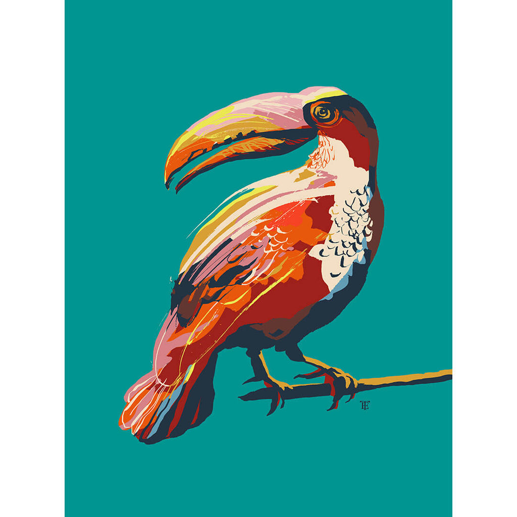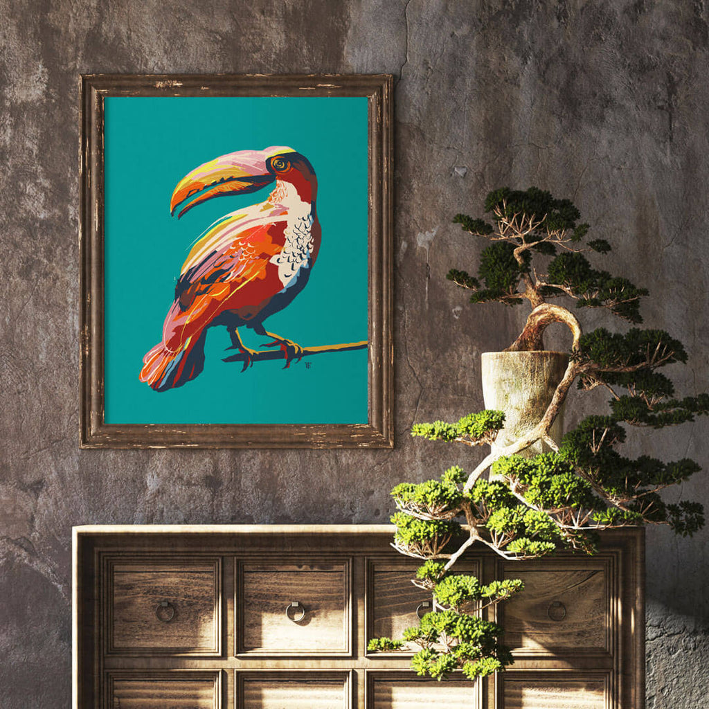 The first time I saw a toucan in-person, I thought for sure its beak was plastic and strapped onto a more ordinary bird. These birds are so vivid-looking that they don’t even quite look real to me. I created this modern chinoiserie art print of a toucan in lush colors as a way to pay tribute to this majestic creature. Appoint your grandmillennial, boho, jungalow, or modern coastal interior with this tropical classic.