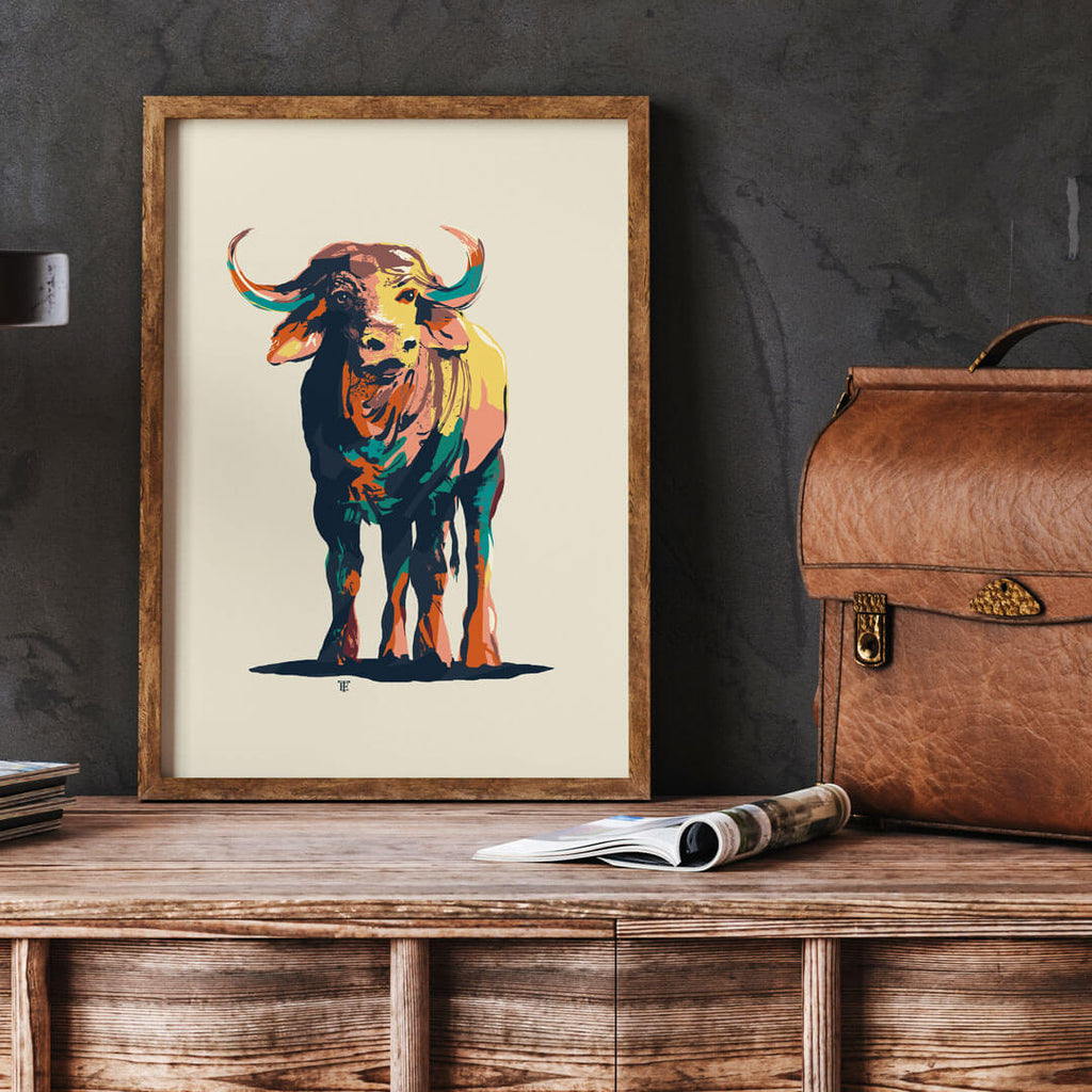 The African Buffalo is a strong, handsome animal found in many parts of the continent. Enrich your decor with this modern Cape Buffalo art print in masculine forms and colors.